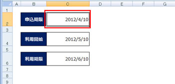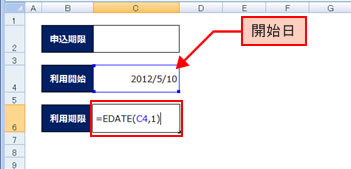 ここでは、セル C4 に入力されている日付を開始日として、1 か月後の日付をセル C6 に、