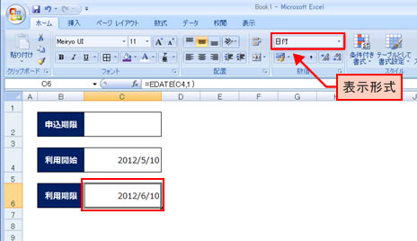2. セル C4 の日付 (2012/5/10) の 1 か月後の日付が表示されます。