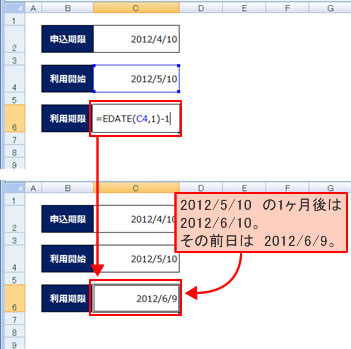 4. セル C4 の日付 (2012/5/10) の 1 か月前の日付が表示されます。