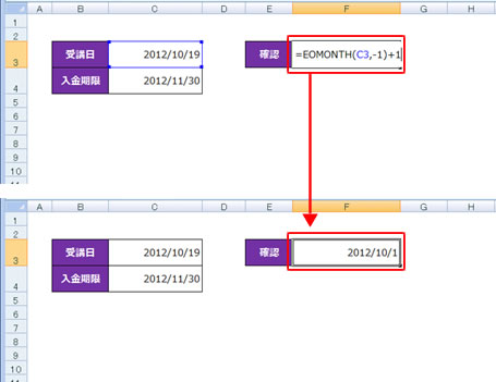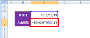 2. セル C3 の日付 (2012/10/19) の翌月末の日付が表示されます。