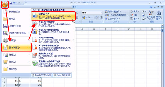 ドキュメント情報パネルは、[Office ボタン] をクリックして [配布準備] の [プロパティ] をクリックして表示できます。