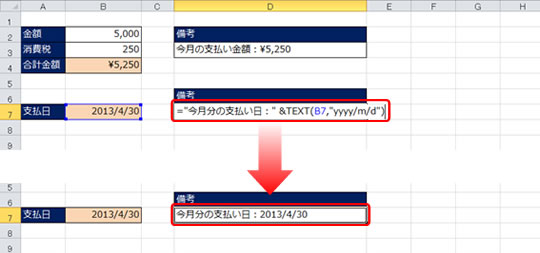 たとえば、「今月分の支払い日:」という文字列とセル B7 の日付を結合すると、下図のように表示されます。