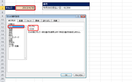 「サンプル」の表示のところにシリアル値が表示されています。すなわち、何も表示形式を設定していない裸の?状態なら「2013/4/30」は「41394」という値だということです。