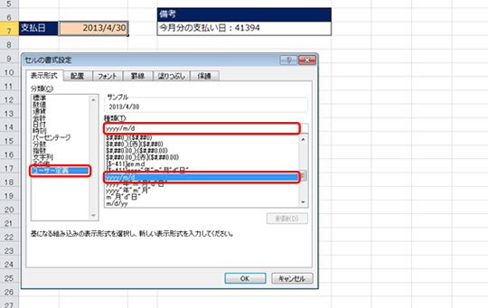 今回の例の場合は、セル B7 の数値を 2013/4/30 と表示したいので、