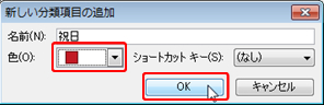 [色分類項目] ダイアログ ボックスの [祝日] に色が設定され、