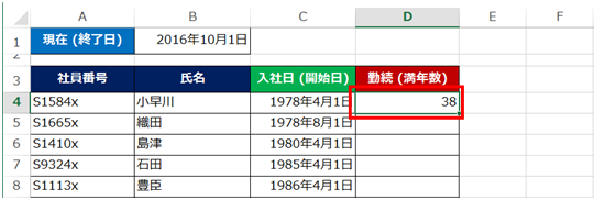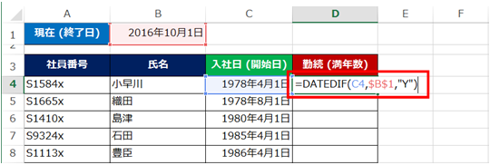 DATEDIF 関数を使って、社員の勤続年数が、「2016年10月1日」の時点で何年なのかを求めてみます。
