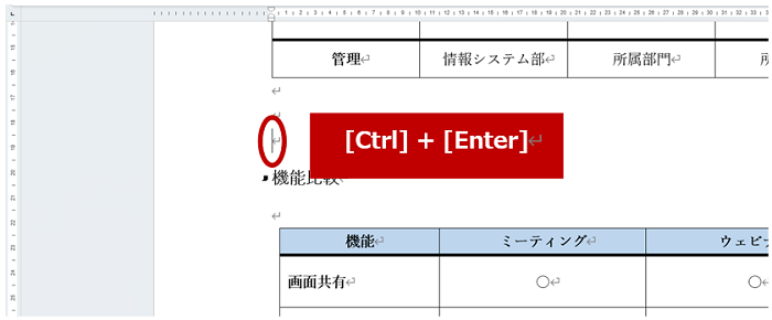 ①改ページを挿入する位置にカーソルをおいて、[Ctrl] + [Enter] を実行します