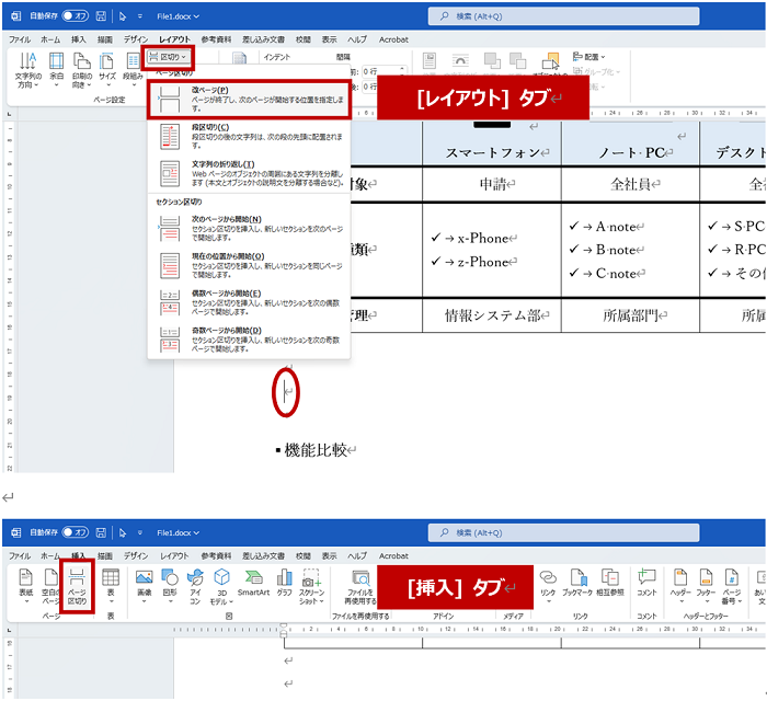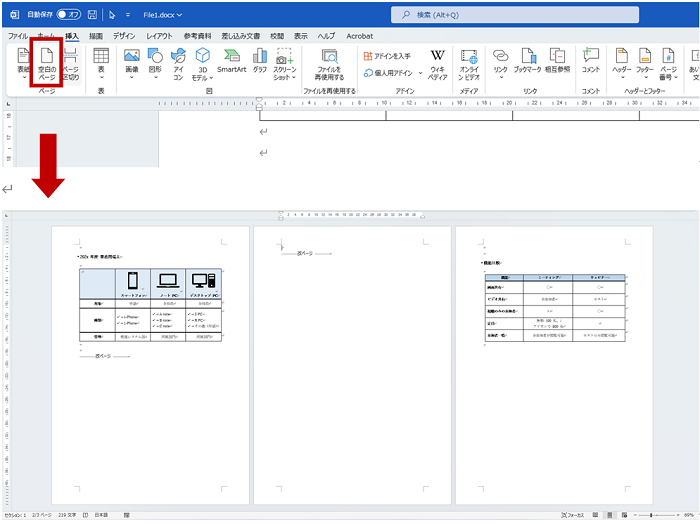 リボンの [挿入] タブの [ページ] グループの [空白のページ] の場合は、カーソルの位置に 1 ページ挿入され、改ページも追加されます。