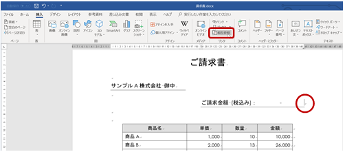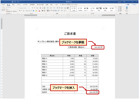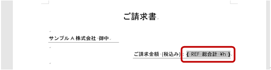 今回は、請求書の総合計の金額にブックマークを設定し、請求金額として別の場所にも表示されるようにしてみます。