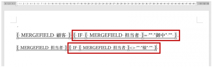 1 つ目の赤枠が、「担当者フィールド (MERGEFIELD 担当者) が空白 ("") だったら "御中" と表示し、そうでなければ空白 ("") を挿入せよ」と記述されており、2 つ目の赤枠が「担当者フィールドが空白ではなかったら (<>) "様" と表示し、そうでなければ空白を挿入せよ」という処理が記述されています。