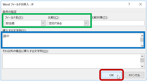 「担当者フィールドが空白だったら "御中" と表示し、そうでなければ空白を挿入せよ」としたいので、[フィールド名] に [担当者] を指定し、[比較] で [空白である] を選択して、[挿入する文字列] に「御中」と入力して [OK] をクリックします。