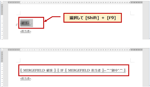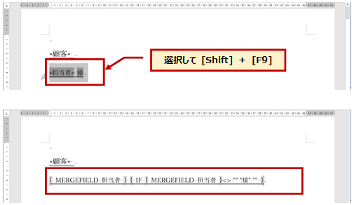 [顧客] と [担当者] のフィールドの後ろに [Ctrl] キー + [F9] キーを押して { } を入力し、そのカッコの中に If 文 による処理を記述します。