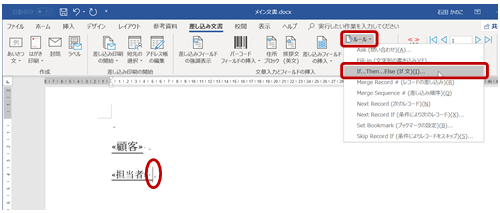 - “様” と表示したい位置にカーソルをおき、リボンの [差し込み文書] タブの [文章入力とフィールドの挿入] グループの [ルール] をクリックし、[If...Then...Else (If 文) ] をクリックします。