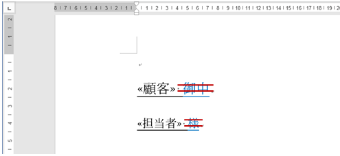 下図のように、差し込みフィールド外に “御中” や “様” を文字列で書いてしまうと、担当者名があろうとなかろうと、すべてに “御中” も “様” も表示されてしまいます。