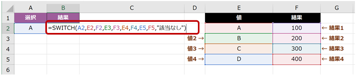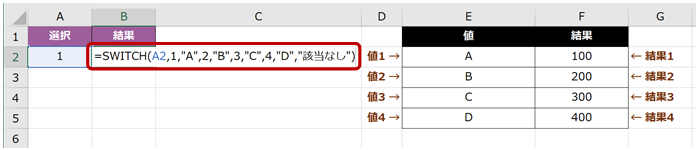 たとえば、「=SWITCH(A2,1,“A”,2,”B”,3,”C”,4,”D”,”該当なし“)」という数式の場合、セルA2 の値が「1 なら A」「2 なら B」「3 なら C」「4 なら D」が返り、1 でも 2 でも 3 でも 4 でもなければ該当なしという文字列が返ります。