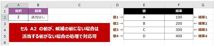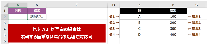 該当する値がない場合に返す値 には、確認する値のセルが空白だったり、対象外の値だったりしたときにどうするかを指定します。