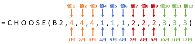 =CHOOSE(B3,"第4四半期","第4四半期","第4四半期","第1四半期","第1四半期","第1四半期","第2四半期","第2四半期","第2四半期","第3四半期","第3四半期","第3四半期")