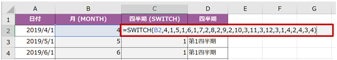 SWITCH 関数を使って四半期を求める