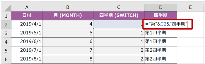 D 列には、C 列の四半期の数字の前後に結合したい文字列を「&」でつないだ数式を作成しています。