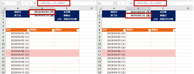 開始日や終了日は、手入力でその日付をどこかのセルに入れておいてもよいですが、今回の場合は、セル B1 に MIN 関数を使ってカレンダーの [日付] 列の最小値 (すなわち開始日) を、セル B2 に MAX 関数を使って最大値 (すなわち最終日) を取得して表示しています。