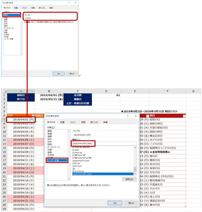 たとえば、今回のカレンダーの「2019/04/01 (月)」のセルは、シリアル値でいうと「43556」。これに表示形式を適用して見た目を変更してあります。