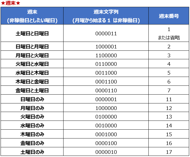 表を見ればなんとなくわかると思いますが、週末文字列は、月曜日を先頭に日曜日までを 1 (非稼働日) と 0 (稼働日) で指定します。ということで、「土日を非稼働日としたい」は「“0000011”」です。