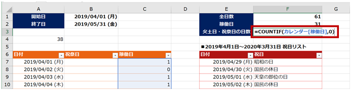この列さえあれば、稼働日を数えたいときも、非稼働日を数えたいときも、どっちにも対応できます。