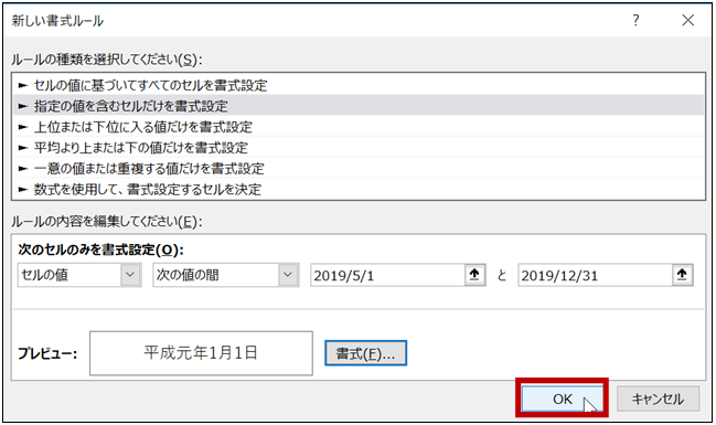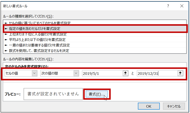 - [新しい書式ルール] ダイアログ ボックスで [指定の値を含むセルだけを書式設定] を選択し、ダイアログ ボックスの下部で [セルの値] [次の値の間] と指定して、「2019/5/1」と「2019/12/31」を入力し、[書式] をクリックします。