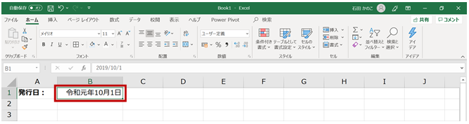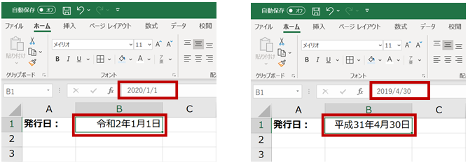 - 選択したセルに条件付き書式が設定され、日付が「2019/5/1 から 2019/12/31」の間、つまり令和 1 年の場合は、令和元年と表示されます。