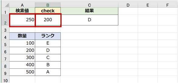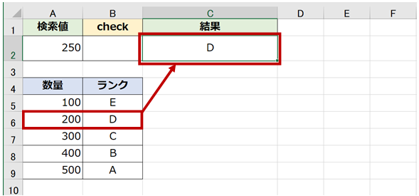 - 「250」という値は A5:A9 には存在しないため、それを超えない近しい値である「200」を使って結果が返ります。