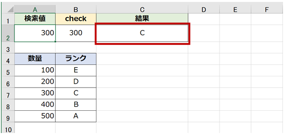 - セル A2 が検索値、A5:B9 が範囲、返す列は 2 列目 ([ランク] 列)、検索の型を TRUE として数式を作成してみます。