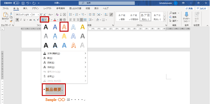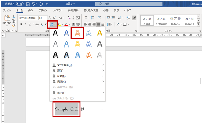 - 文字列を選択し、リボンの[ホーム]タブの[フォント]グループに[文字の効果]をクリックして、文字列に適用する効果をクリックします。