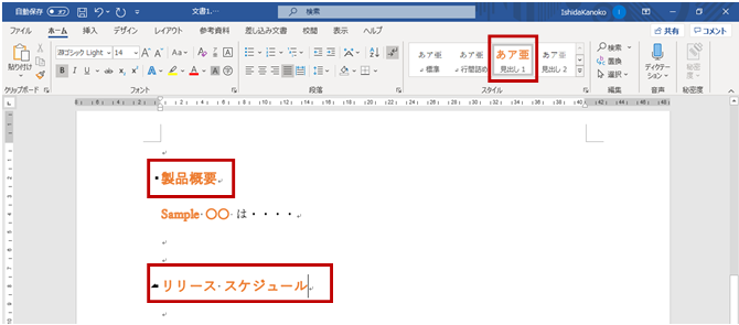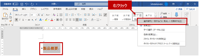 文字の効果を設定した文字/段落を選択し、リボンの [ホーム] タブの [スタイル] ギャラリーで、文字の効果を含めるスタイル(見出し1) を右クリックし、[選択箇所と一致するように〇〇を更新する] をクリックします。