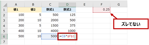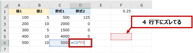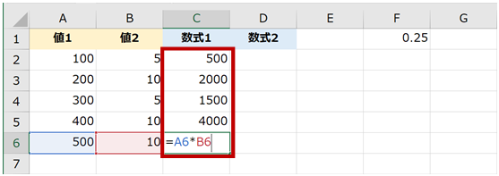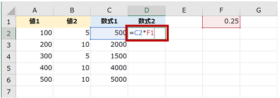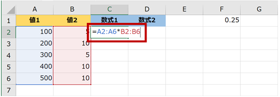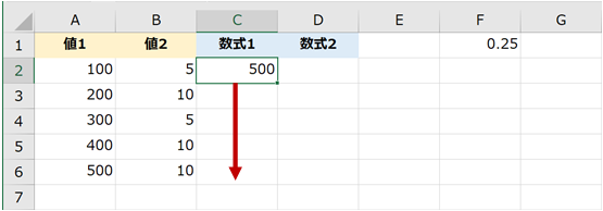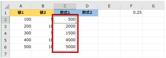 下図の [数式1] の結果にセル F1 の値を掛け算した結果を [数式2] の列に表示したいとします。