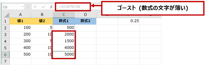 スピルによって配列 (んー、いま配列がわからない方は 範囲 だと思ってもよい、かな) を利用する数式 (セル C2) を動的配列数式といい、結果 (セル C3 から C6) をゴーストといいます。