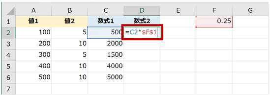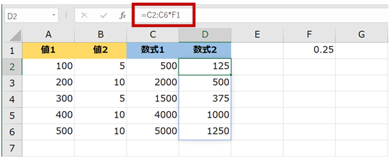 - セル D2 に、掛け算に使用する値の格納されているセル範囲を指定した数式を作成する