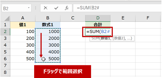 たとえば下図で、SUM 関数を使った数式を作成するときに、スピル領域をドラッグしたりキー操作で範囲選択したりすると、今までの感覚でいけば、「=SUM(B2:B6」と参照範囲が表示されるところですが、選択した領域がスピル領域の場合、自動的にスピル範囲演算子による指定がなされます。