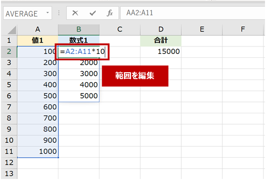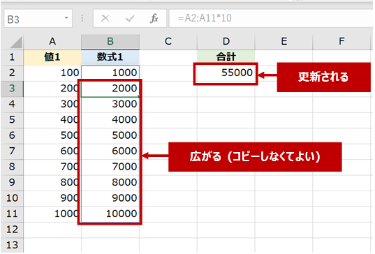 たとえば、[値1] に格納されるデータの個数が変わったとき、[数式1] の動的配列数式を編集するだけで数式のコピーし直しもいらないし、SUM 関数の数式を編集する必要もありません。(テーブル使えば範囲広がるじゃない?とかそれはそれ。いまはスピル範囲演算子の話)