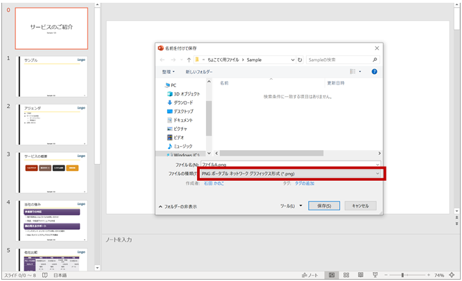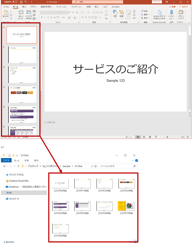 保存の際に指定した場所に、(すべてのスライドを選択した場合は) 元になったPowerPoint のファイル名と同じ名前をフォルダーが作成され、その中に画像ファイルが出力されていることを確認できます。
