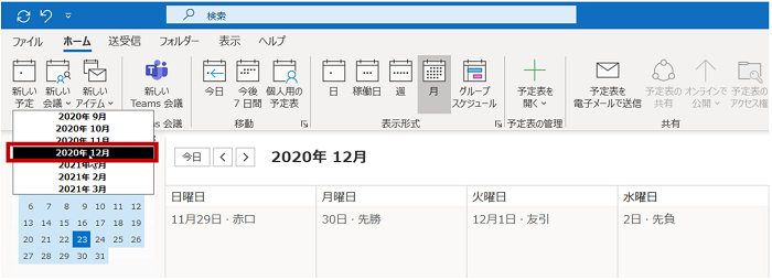 上図の枠がついているところ (2020年 12月 と表示されているところ) をぐーっと長押しすると、下図のように前後 3 カ月の月の一覧が表示されます。