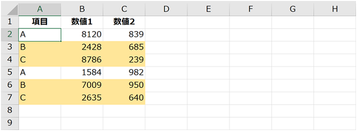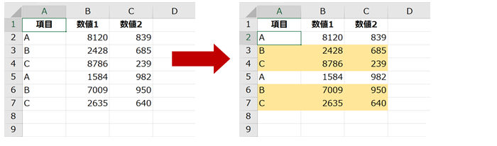 たとえばこんな感じで、[項目] 列が A という文字列以外の行に色を付けたい、というような内容です。こちらをやってみましょう。