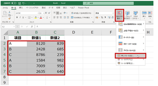 1.条件付き書式を設定する場所 (セル範囲) を選択し、リボンの [ホーム] タブの [セルのスタイル] グループの [条件付き書式] をクリックし、[新しいルール] をクリックします。