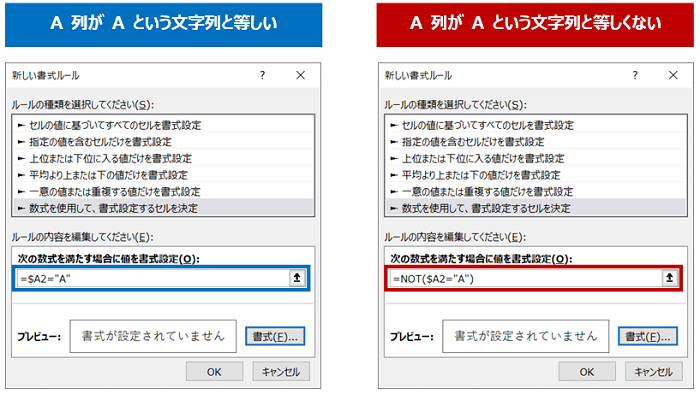 「=$A2="A"」は、簡単にいうと「A 列が A という文字列と等しい」という条件です。今回はこれを逆にして、「A という文字列と等しくない」としたいので、「=NOT($A2="A")」のように NOT 関数を使って逆転させます。