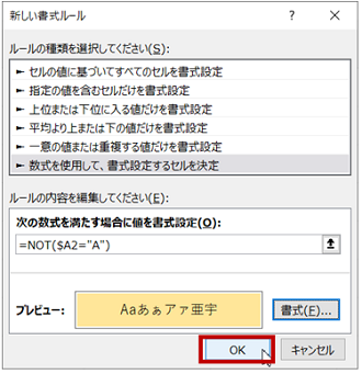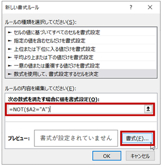 なお、「=NOT($A2="A")」と同等の指定をする別の数式については、最後におまけで書いてありますのでそちらもご覧ください。
