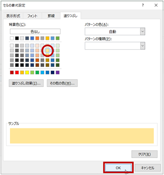 4.[セルの書式設定] ダイアログ ボックスの [塗りつぶし] タブを選択し、条件に一致したときに適用したい塗りつぶしの色を選択して、[OK] をクリックします。