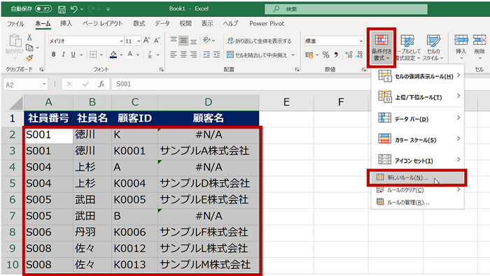 条件付き書式を設定する場所 (セル範囲) を選択し、リボンの [ホーム] タブの [セルのスタイル] グループの [条件付き書式] をクリックし、[新しいルール] をクリックします。