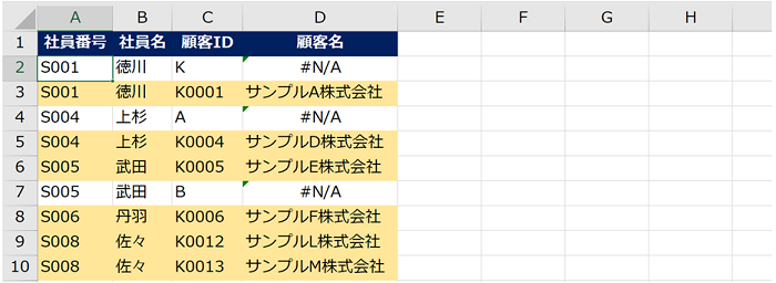 今回はその NOT 関数を使用する例として、下図のように指定した列の値がエラー値以外の行に色を適用します