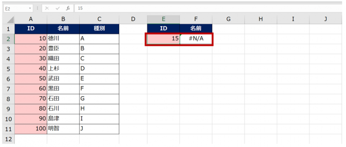 なお、XLOOKUP 関数では今回のように最低限の 3 つの引数だけを指定していて、特に指定をしなければ完全一致で検索しますので、たとえば下図の「15」のような完全に一致する値が検索範囲に存在しない場合は #N/A エラーが返ります。