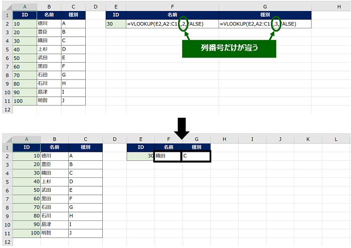 下図では、列番号だけが異なる 2 つの数式をそれぞれのセルに用意しています。