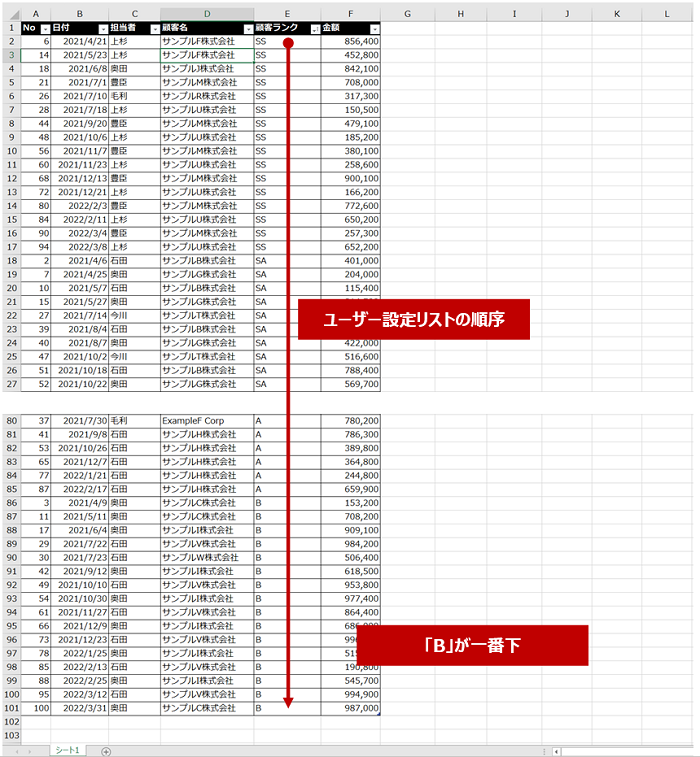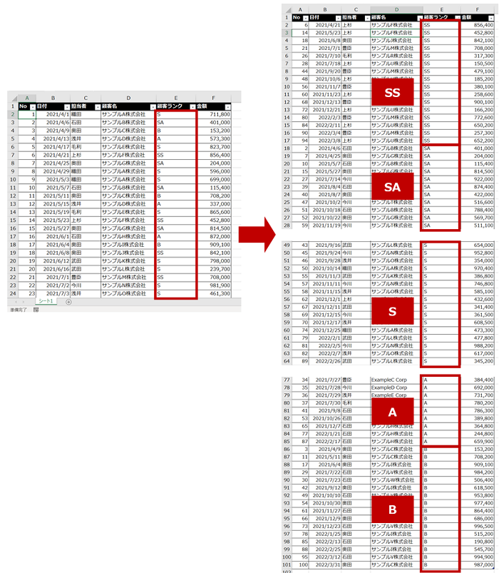 たとえば、下左図の [顧客ランク] 列には「SS」「SA」「S」「A」「B」という文字列が格納されていますが、これを下左図のように、顧客ランクのカタマリを作ってランクの高いデータから順に表示したいとき、単純な [降順] では「A」のカタマリが一番下にきます。
